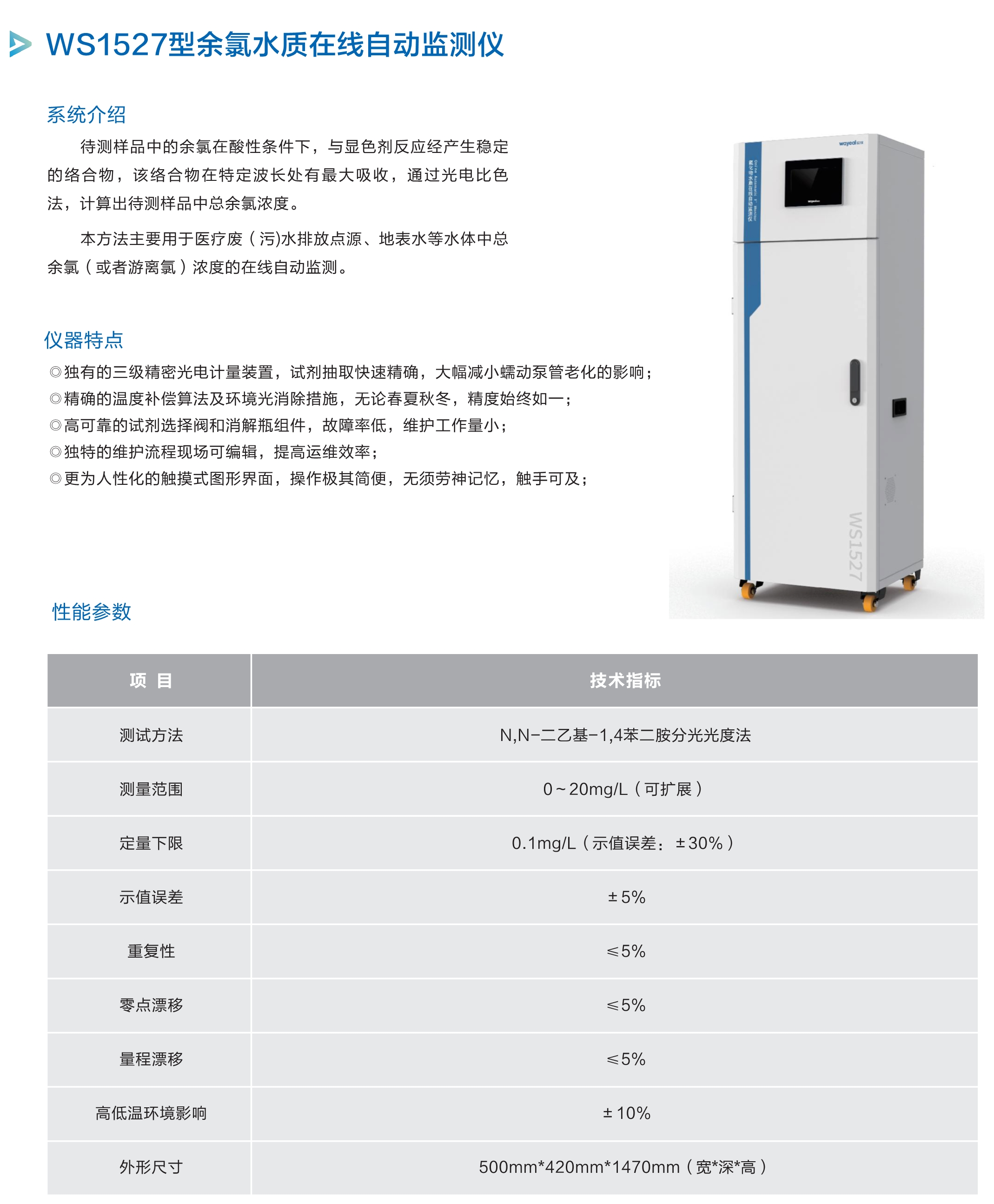 本方法主要用于医疗废(污)水排放点源、地表水等水体中总余氯(或者游离氯)浓度的在线自动监测。